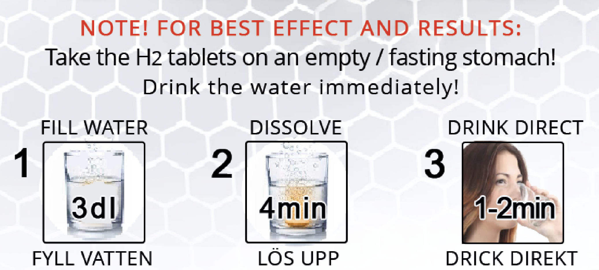 för maximal effekt, ta 2 tabletter i vattnet. Eftersom det är