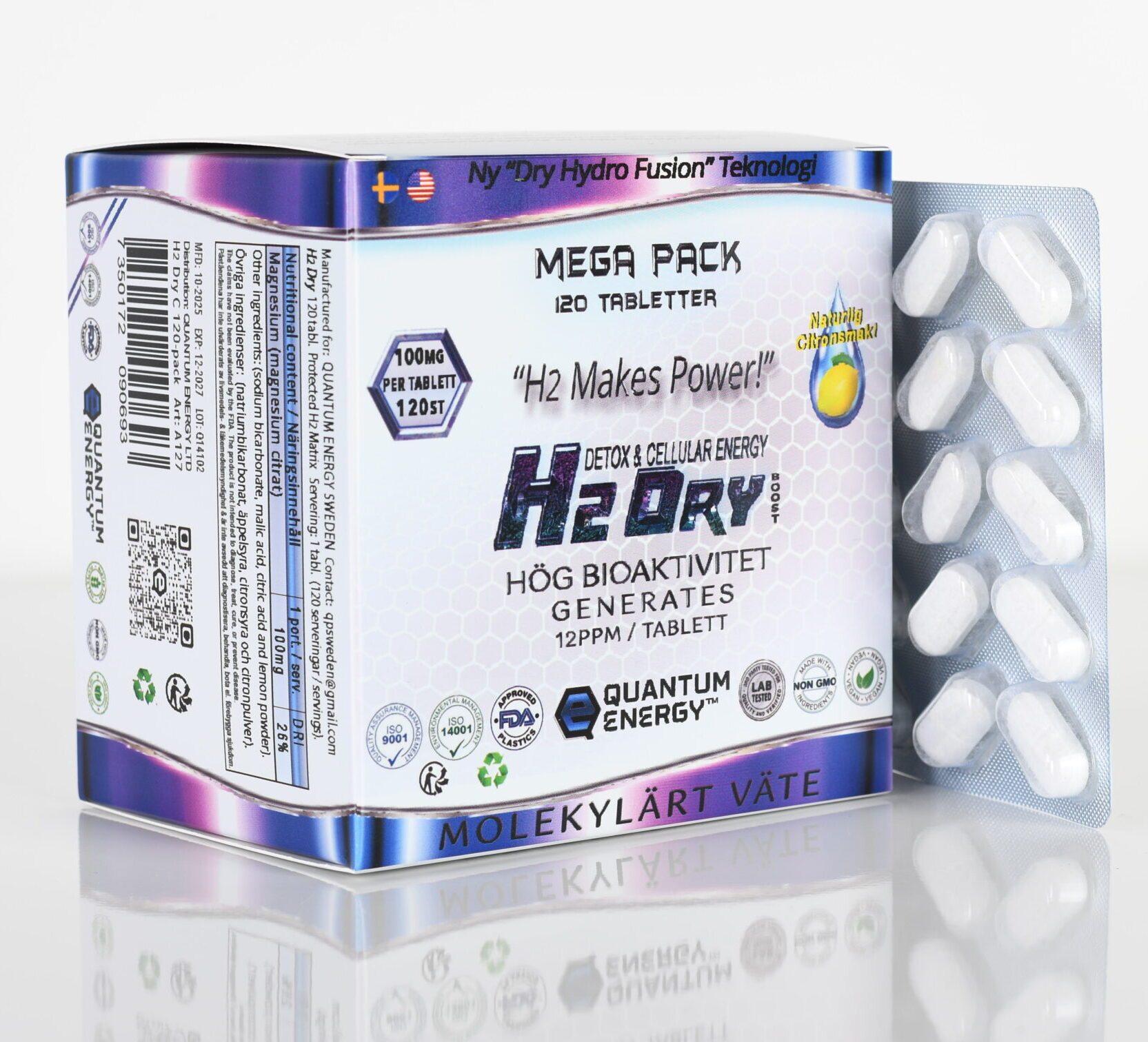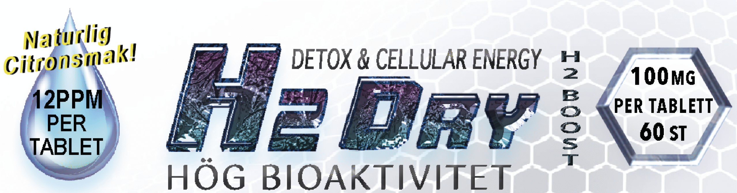 H2 Dry Boost, är ett tillskott i tablettform som ska lösas upp i vatten. Tabletterna innehåller magnesium och är inkapslade med bland annat vätedioxid, som i lös gasform benämns ”molekylärt väte” när det kommer i kontakt med vatten.