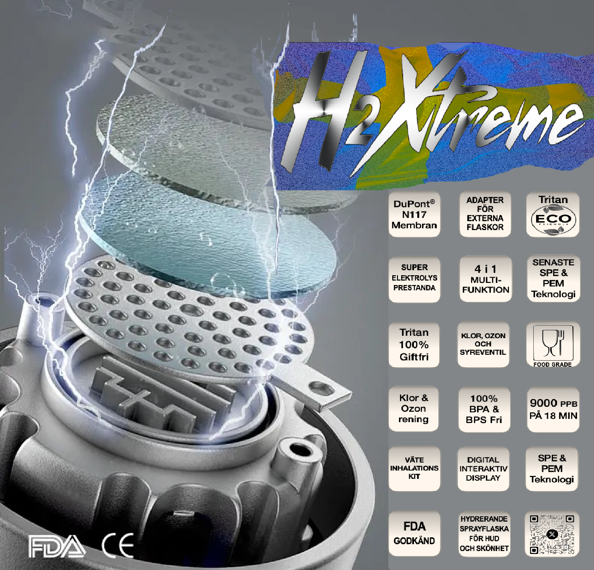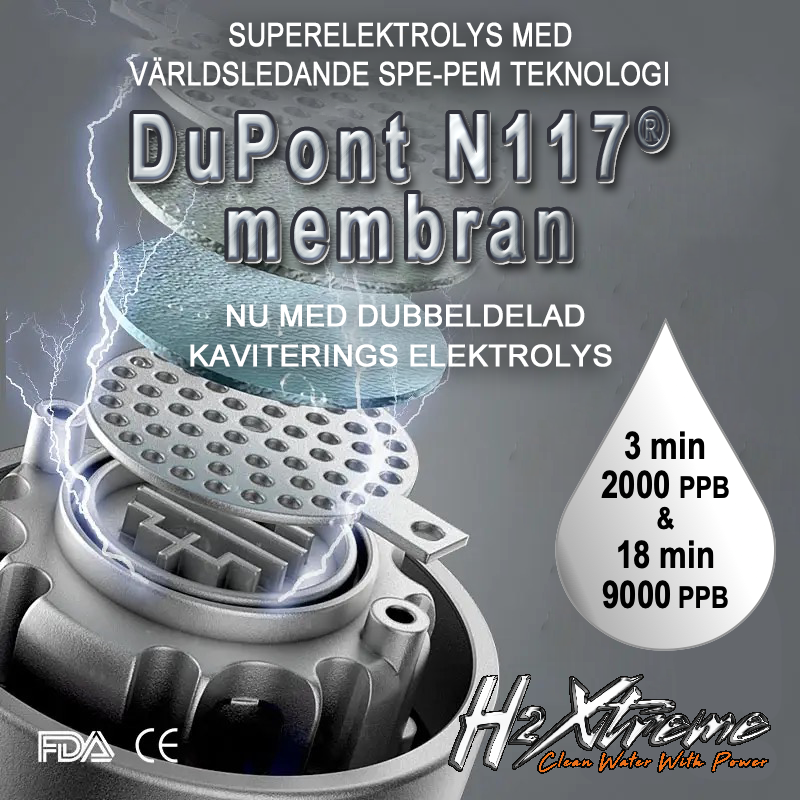 H2 Xtreme har den senaste SPE- och PEM-tekniken med super elektrolys prestanda med dual-mode split-cavity elektrolys, för en effektiv och hög väteinfusion. Den är designad för att producera ett extremt högt PPB värde, på bara några minuter. Detta är mer gynnsam för mänsklig absorption. Genom det högeffektiva DuPont® N117 membranet som separerar bort syre och ozon och endast väte tillåts passera genom vattnet, vilket gör att koncentrationen av löst väte elektroner kan maximeras.