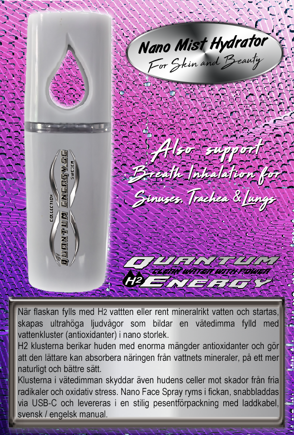 Flaskans blå UV-ljus tar bort en del bakterier och virus, därigenom kan man även använda Nano sprayen som en inhalator på ett fördelaktigt och förebyggande sätt. Genom att inandas nanodimman med djupa andetag i mun eller näsan för att hydrera bihålor, luftrör och lungor med mänger av helt naturliga antioxidanter som är förebyggande och skyddar cellerna från skada orsakad av fria radikaler.